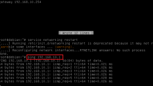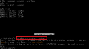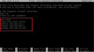 Selanjutnya, masukkan perintah nano /etc/network/interfaces kemudian enter Pada contoh saya akan memasukkan IP 192.168.10.1 netmask 255.255.255.0 dan gateway 192.168.10.254. Masukkan perintah seperti dibawah ini :   Simpan konfigurasi dengan menekan tombol ctrl+x kemudian y dan enter Setelah itu restart konfigurasi dengan perintah /etc/init.d/networking restart atau service networking restart   Jika tidak ada failed berarti konfigurasi telah berhasil. Silahkan lanjutan pengecekan dengan mengetikkan ping ip gateway atau ping ke ip sendiri.     Sekian dan terimakasih